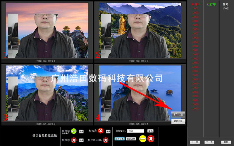 1. 人拍照完成后,電腦后臺可出現打印編號和{4張圖片}任選打印,打印方式直接將鼠標移至該圖片右下角會顯示【打印】按鈕